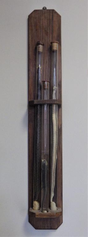 De nombreux spécimens sont fixés sur un socle en bois, peint ou vernis, parfois protégés d’une cloche en verre ou en plexiglas. L’étiquette fixée sur le socle et portant la dénomination n’est généralement pas d’origine. Il est donc très difficile de déterminer le nom des fournisseurs. Nous pouvons seulement supposer que la plupart des objets proviennent des maisons Tramond, Deyrolle, Boubée et Auzoux