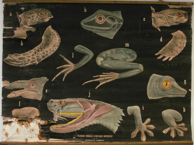 Quelques spécimens de la classe des reptiles et la classe des amphibiens sont présents, notamment un crocodile, un boa et un lézard naturalisés, des spécimens en bocaux (vipères, couleuvres, agame, dragon-volant, lézard et salamandre), des carapaces de tortues et des squelettes de serpents, grenouilles et lézards.