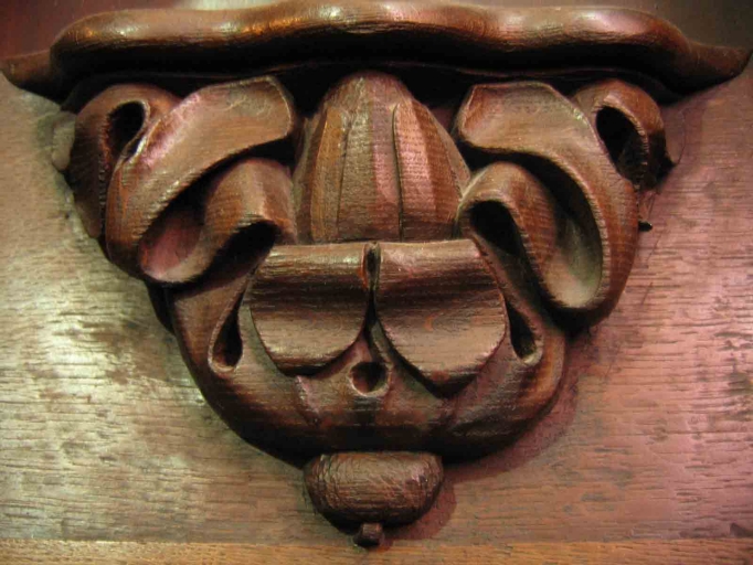 Appui-main et miséricorde provenant de l'abbaye cistercienne Notre-Dame de Buzay et remontés sur une stalle du 19e siècle lors de l'aménagement du chœur de l'église Saint-Symphorien.