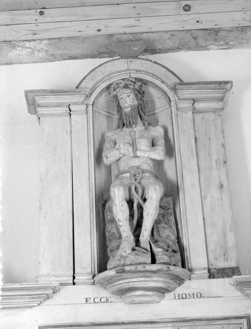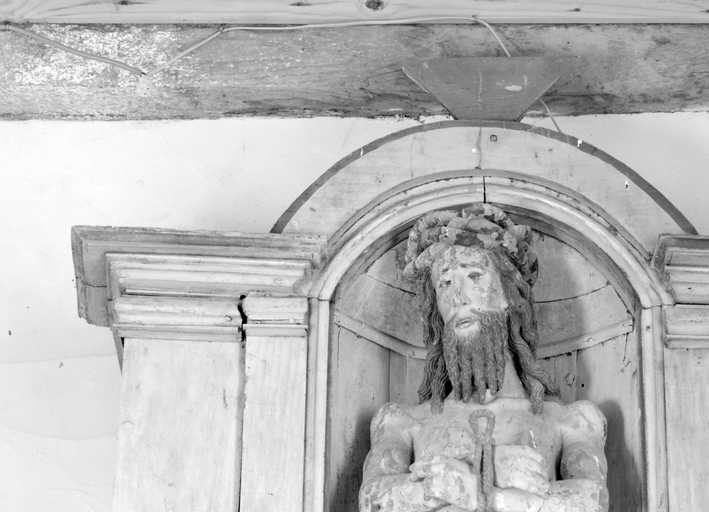 Le Christ est assis sur un muret en pierre. Il porte un perizonium. Son corps est couvert de blessures sanguinolentes dont la couleur rouge contraste avec la couleur de sa peau.