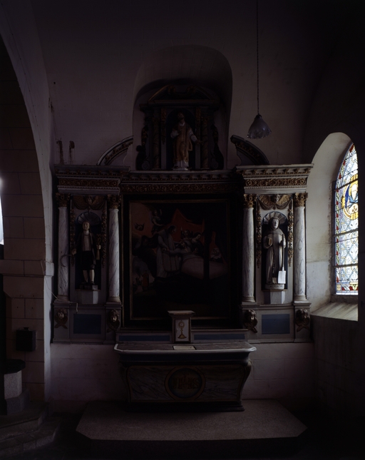 Autel de plan rectangulaire à élévation galbée posé sur un emmarchement à un degré ; retable à corps central enfermant le tableau ; ailes à niches concaves flanquées de 2 colonnes ; niche de couronnement encadrée de deux colonnes.