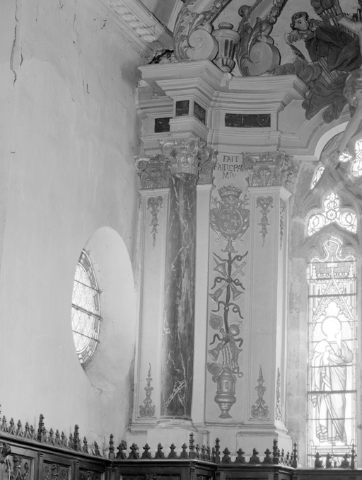 Décor de trophées à emblèmes liturgiques : croix et bougeoir en sautoir ; ostensoir et ciboire en sautoir ; encensoir fumant à la base ; à droite : ostensoir et calice en sautoir ; ciboire et croix en sautoir ; lampe de sanctuaire à la base.