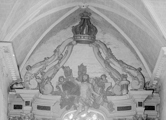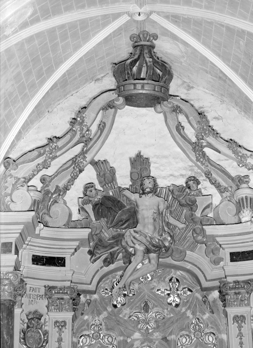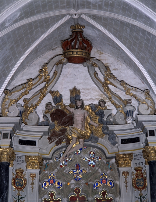 Retable de plan concave à 2 ailes encadrant la verrière du chevet ; dais de couronnement à 4 volutes supportant une couronne fermée.