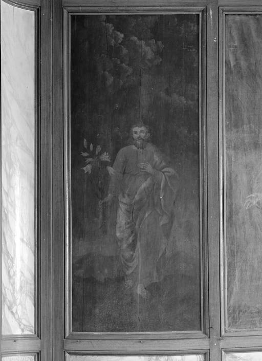 Inscription peinte au dessus des 3 toiles : AUTEL PRIVILEGIE A PERPETUITE. BREF DE S.S.LEON XIII 15 NOVEMBRE 1878 ; Inscription peinte au bas des panneaux : ST JEAN EVANTE ; PERE MAUNOIR ; STE FRANÇOISE VEUVE ROMAINE ; ST BONIFACE ; ST MATHIEU EVANTE.