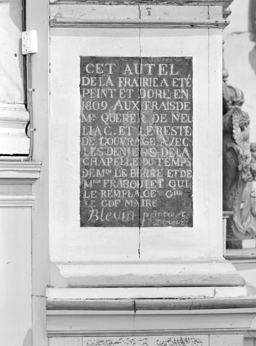 Inscription sur le piédestal face nord : CET AUTEL DE LA FRAIRIE A ETE PEINT ET DORE EN 1809 AUX FRAIS DE MR QUERER DE NEULLIAC ET LE RESTE DE L'OUVRAGE AVEC LES DENIERS DE LA CHAPELLE DU TEMPS DE MIN LE BERRE ET DE MRIN FRABOULET QUI LE REMPLACE CME LE GOF MAIRE. BLEVIN PEINTRE ET DOREUR.