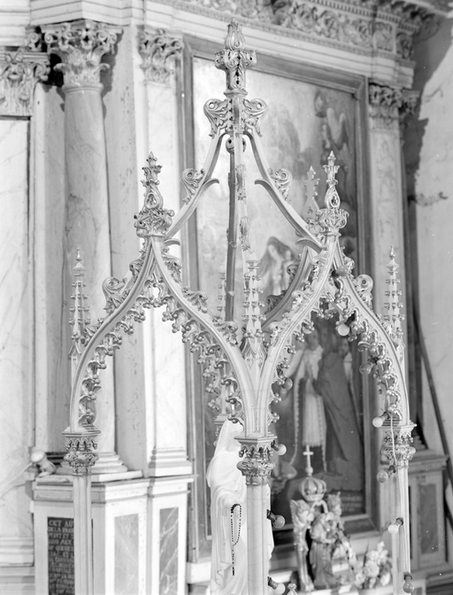 Dais à arcatures gothiques et socle supportant une statue de plâtre.