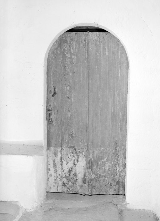 4 planches jointives ; 2 traverses au revers assemblées par enfourchement dans le montant pivot ; clef en fer forgé à tige bénarde ; entrée de serrure et poignée d'un seul tenant.
