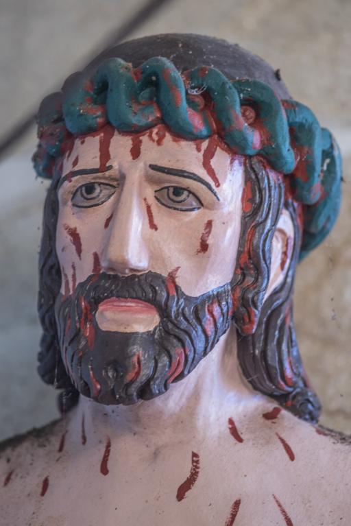 Sa tête est couronnée d’épines. On peut voir des gouttes de sang sur son front mais également du sang dans ses cheveux car la couronne le blesse. Ses yeux sont ouverts, ils sont très cernés et le Christ regarde vers le bas.