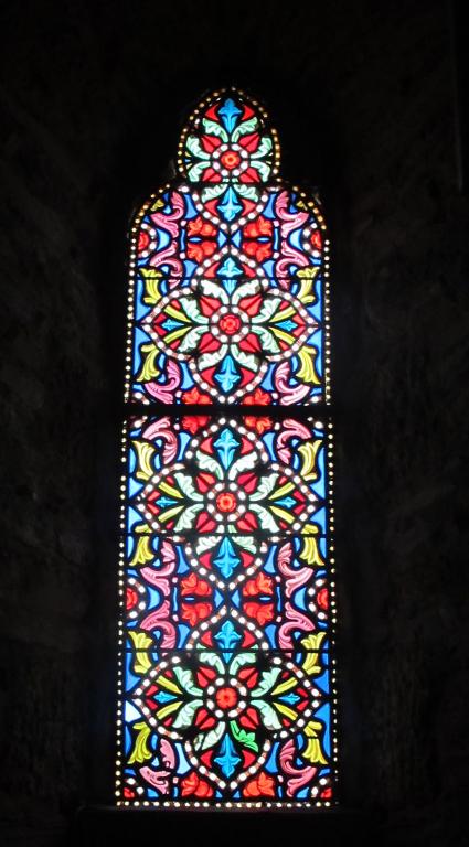 Trois verrières ornementales de la fin du 19e siècle ont adopté le style néo-gothique comme celle de la tribune, ou néo-renaissance, comme celle de l’escalier qui mène à cette même tribune.