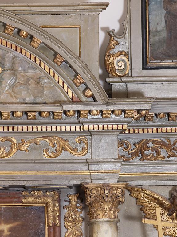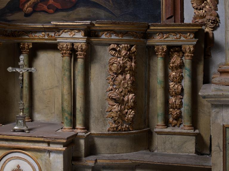 Autel tombeau à élévation galbée posé sur un emmarchement ; retable architecturé à quatre colonnes qui déterminent trois travées, fronton semi-circulaire au-dessus de la contre-table ; niveau de couronnement occupé par de petits tableaux au-dessus des parties latérales, qui encadrent une statuette ; deux statues dans les niches latérales ; la travée centrale est occupée par un tableau.