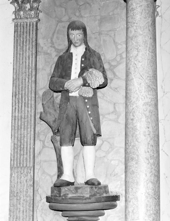 Longueur du retable. Hauteur des statues : Sacré-Cœur : h = 160 cm ; saint Isidore : h = 155 cm ; sainte Germaine de Pibrac : h = 150 cm.