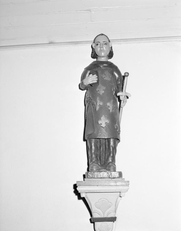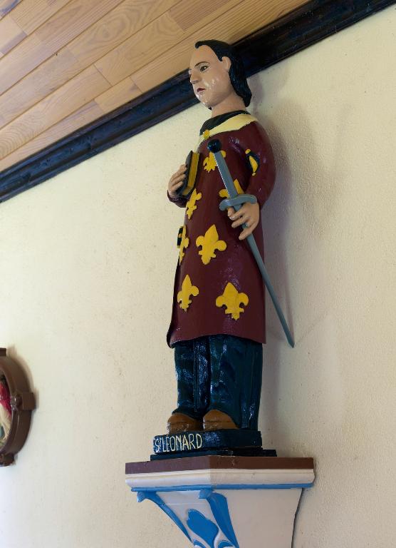 Saint Léonard porte ici une dalmatique de diacre dont le décor fleurdelisé rappelle ses attaches avec la cour du roi Clovis dont il était le filleul. L'épée qu'il tient dans la main gauche semble incongrue puisque, ayant reçu du même Clovis le privilège de délivrer les prisonniers, il est d'habitude représenté tenant des chaînes, comme on le voit dans la verrière où il est également représenté.