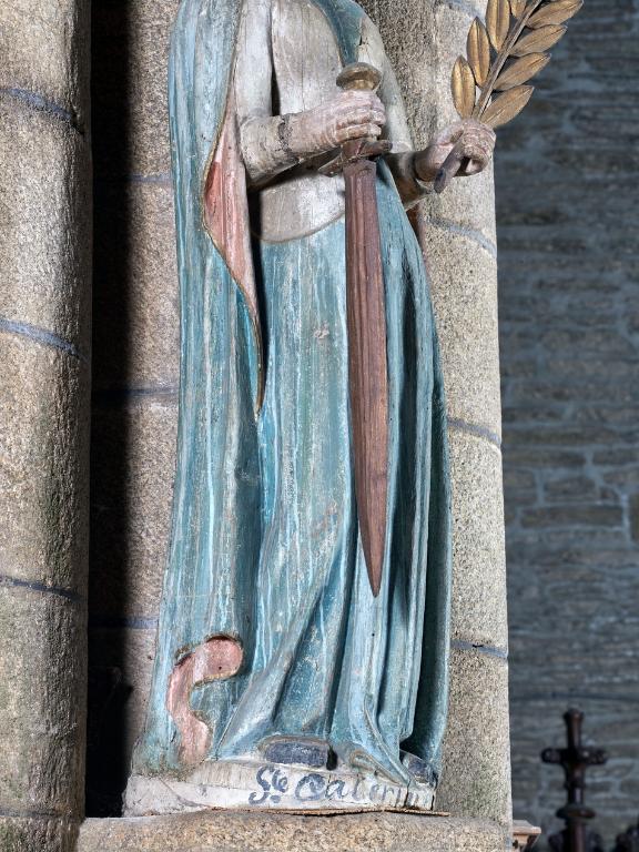 Elle porte une robe près du corps marquée à la taille et un manteau posé en arrière des épaules, se retournant au niveau des coudes et descendant jusqu'à ses pieds. La jupe tombe en longs plis serrés. Les bras disposés à angle droit mettent en avant à dextre l'épée et à senestre la palme du martyre. Enfin, elle porte une couronne ouverte surmontée d'ornements en forme de trèfle. Les cheveux sont coiffés vers l'arrière.