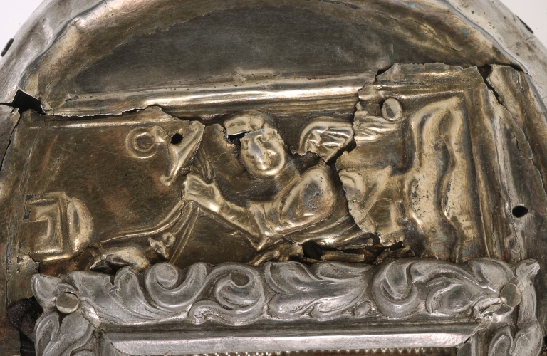 La forme quadrilobée à redents, est traditionnellement associée, depuis l´époque gothique, aux reliques de la Croix du Christ. Elle se retrouve par exemple sur un petit reliquaire pendentif du XIVe siècle, conservé à Lannilis, sur lequel une inscription d´origine, atteste de cet usage. Ici, la fenêtre d´origine, sans doute unique et en forme de croix étroite, à l´instar de la croix ciselée au revers, devait symboliser la relique entrevue, probablement un fragment de la Vraie Croix. Elle a été remplacée au XIXe siècle par une large lunette à trois compartiments, permettant de présenter des reliques de saint Vincent Ferrier et de saint Golven. Pour ce faire, les anges thuriféraires latéraux de la face antérieure ont été remontés à la verticale. Le revers du reliquaire a conservé intacte sa disposition initiale. Sur chacune des faces du reliquaire, trois anges thuriféraires exécutés au repoussé-ciselé et non par estampage accompagnent un quatrième ange qui semble présenter la couronne d´épine ; celui du revers surmonte l´inscription IHS NAZAREN qui enlève tout doute sur la destination première de l´objet. La graphie de l´inscription ainsi que le style des anges permette de situer l´exécution de l´œuvre vers la première moitié du XVIe siècle, date à laquelle d´importants travaux sont effectués à l´église de l´ancien prieuré de Saint Golven en Taupont, actuellement situé au Vieux Bourg de Taupont, à laquelle appartenait ce reliquaire.
