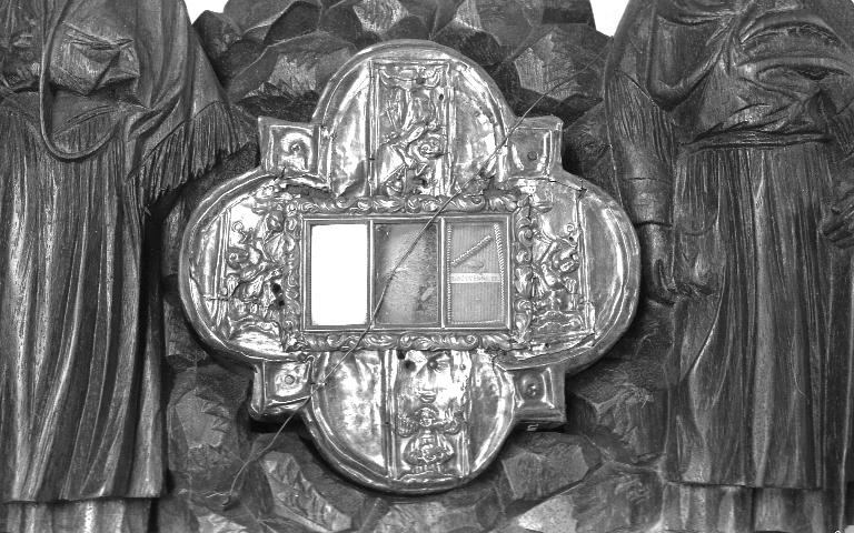 Quadrilobe orné d'anges thuriféraires et d'un ange présentant la couronne d'épines sur les deux faces ; au verso une croix pattée ; le reliquaire est inséré dans une rocaille et encadré de deux femmes en costume breton.