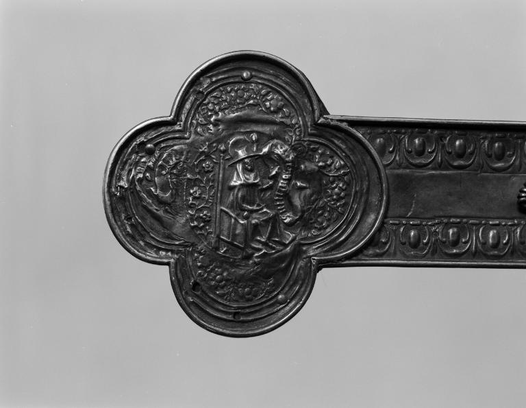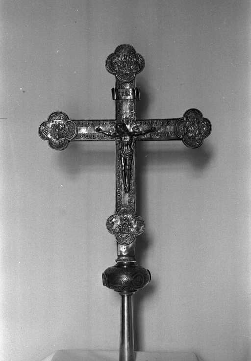 Christ, titulus et médaillons quadrilobés de la première moitié du 16e siècle, remontés au début du 17e siècle avec ré-estampage des docteurs de l'église sur les médaillons de la face antérieure et réfection totale des bras de la croix. Le nœud et la hampe en métal ont été refaits fin 19e ou début 20e siècle.