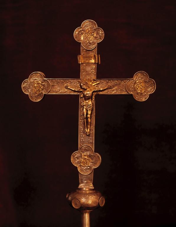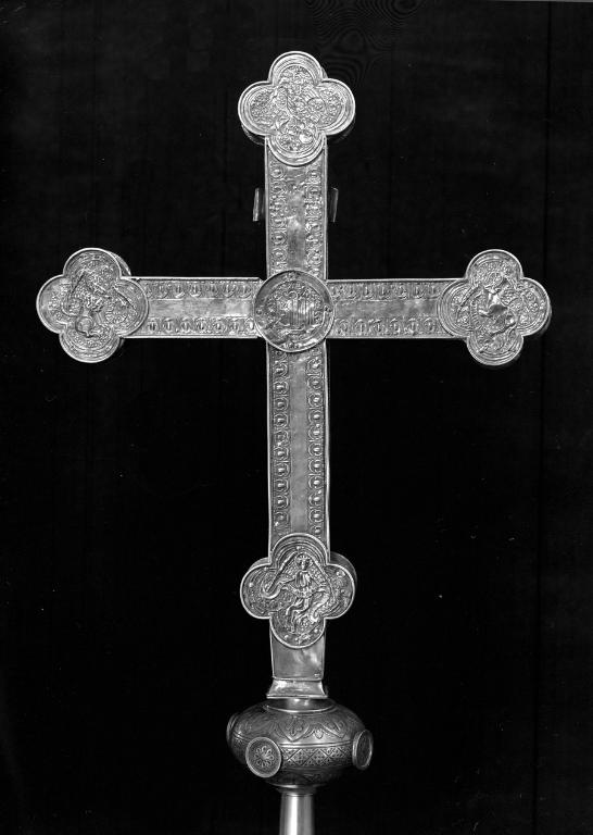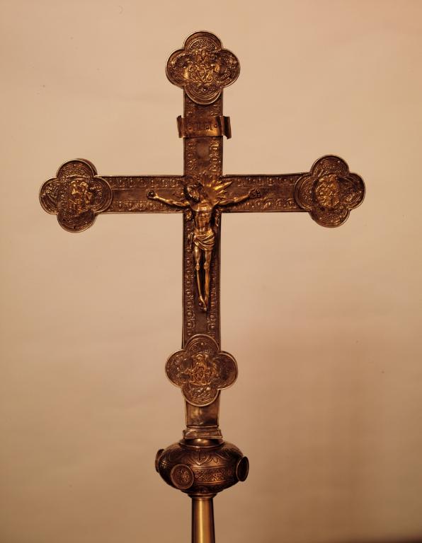 Croix de procession du début du 17e siècle, recomposée par un orfèvre anonyme qui remploya et remonta des éléments de croix de la première moitié du 16e siècle : notamment les médaillons de la face antérieure portant les figures des Évangélistes qui furent ré-estampés au profit des figures des Pères de l’Église.