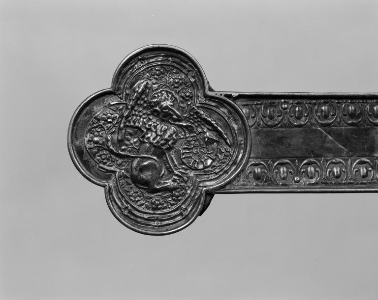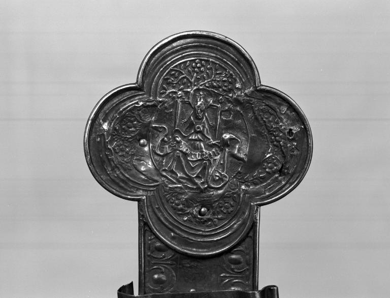 La croix de procession de La Chapelle Caro se rattache à une série du même type, répandu en Bretagne orientale à partir de 1550. Cette simplicité n´est qu´apparente : un examen plus attentif de la technique, du décor et de l´iconographie nous révèle qu´en fait sur ces branches, qu´il a lui-même ornées d´une ligne d´oves, un orfèvre anonyme a maladroitement remonté, au début du XVIIe siècle, des éléments d´une croix du siècle précédent : le médaillon inférieur est légèrement décalé par rapport à la hampe et surtout, sur le revers, le monogramme IHS a été remonté tête en bas, par maladresse ou méconnaissance du symbole. Le titulus aux initiales INRI fermement inscrites en lettres gothiques, le traitement naturaliste de l´anatomie du Christ, le soleil aux rayons sinueux qui nimbe sa tête ainsi que le décor fleuri des quadrilobes dont la forme conserve la tradition du XIIIe siècle, ne laissent pas de doute quant à la datation : entre 1500 et 1550. Au revers, chaque médaillon porte le symbole des Évangélistes. Sur la face principale quatre docteurs de l´Église ont supplanté au début du XVIIe siècle Jean, Marc, Luc et Matthieu : après avoir martelé et plané le centre du médaillon, on a estampé les nouveaux personnages. En même temps qu´elle redécouvrait la richesse littéraire et artistique de l´Antiquité, la Renaissance s´intéressait de plus près aux Pères de l´Église, dont on imprimait alors les ouvrages. Ceux du IVe siècle, Jérôme, Grégoire, Augustin et Ambroise qui s´étaient tournés vers la culture gréco-romaine pour construire une présentation rationnelle de la foi, ont beaucoup séduit les Pères du Concile de Trente (1545-1563), qui tentèrent de faire retourner l´Église aux sources bibliques et patristiques. La croix processionnelle de La Chapelle Caro est une illustration de cette démarche doctrinale.