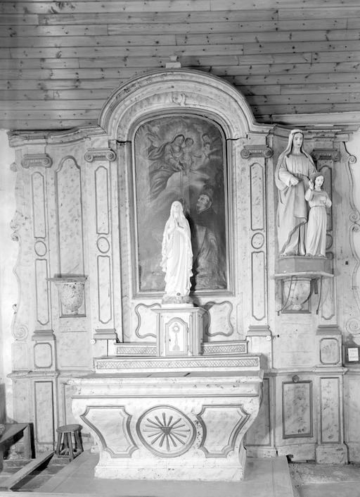 Ensemble de deux autels-retables du 18e siècle, dont les statues ont disparu ; ils ont été complétés de tableaux au 19e siècle. Le tableau du retable nord représente une Donation du Rosaire à saint Dominique. L'ensemble sud est composé d'un retable remployant des éléments de décor du 17e siècle (chutes de fleurs, angelots) ; son autel a été remplacé au 19e siècle ; le tableau, signé et daté : L. Noël 1844, représente un Ange gardien.