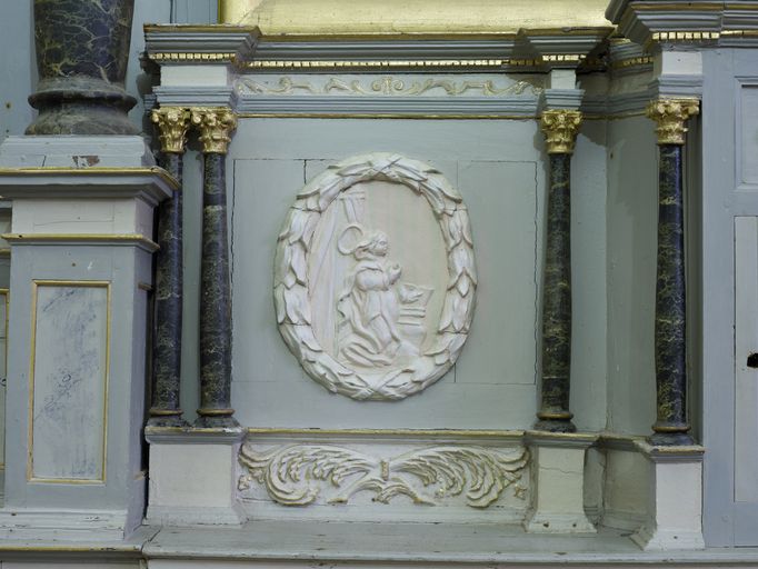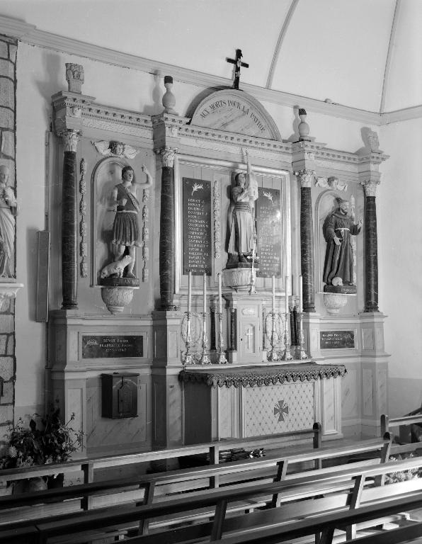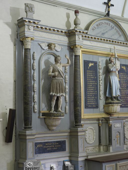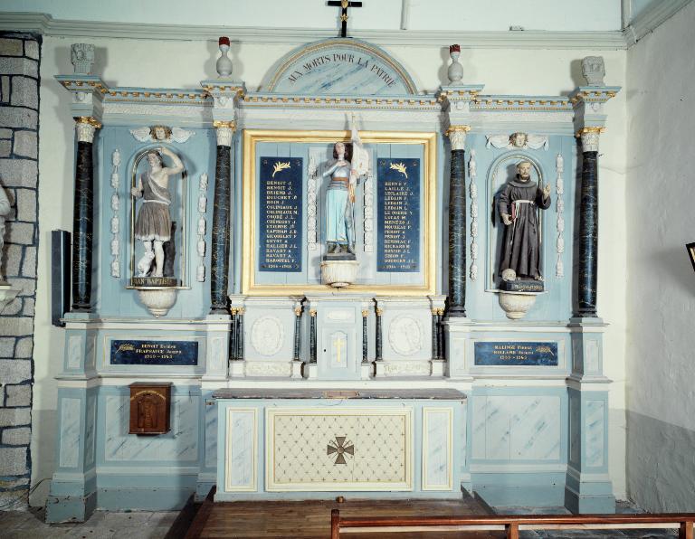 Vers 1925, on a transformé cet autel-retable en monument aux morts : le devant d 'autel s'orne d'une croix de guerre (inexactement représentée, épées les pointes vers le haut) ; la frise, au-dessus des chapiteaux, se teinte d'Art déco. Au centre, on installe une statue de Jeanne d'Arc, commandée chez Bouancheau à Nantes, entre deux plaques de marbre noir portant la liste alphabétique des morts. L'association de tous ces signes - localisation, statue, inscription - permet de mieux interpréter ce monument. La croix qui couronne le fronton et, par dessus tout, sa situation privilégiée dans l'église, en font un monument d'abord religieux, destiné à commémorer le sacrifice des morts. L'inscription "Aux morts pour la Patrie", associée à la croix de guerre, lui donne un caractère patriotique. Le sens de cette double connotation est renforcé par le choix de la statue : Jeanne d'arc vient d'être canonisée en 1920 et symbolise la fidélité aux deux idéaux pour lesquels les soldats sont morts : leur foi et leur patrie.
