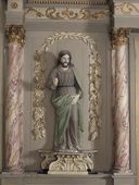 Retable architecturé à 3 travées ; 4 colonnes portent un entablement ; la travée centrale est surmonté d'un fronton semi-circulaire, les travées latérales d'un fronton à volutes ; un tableau (de support et surface de même forme, à sommet cintré) occupe la travée centrale, des statues occupent les travées latérales plates.