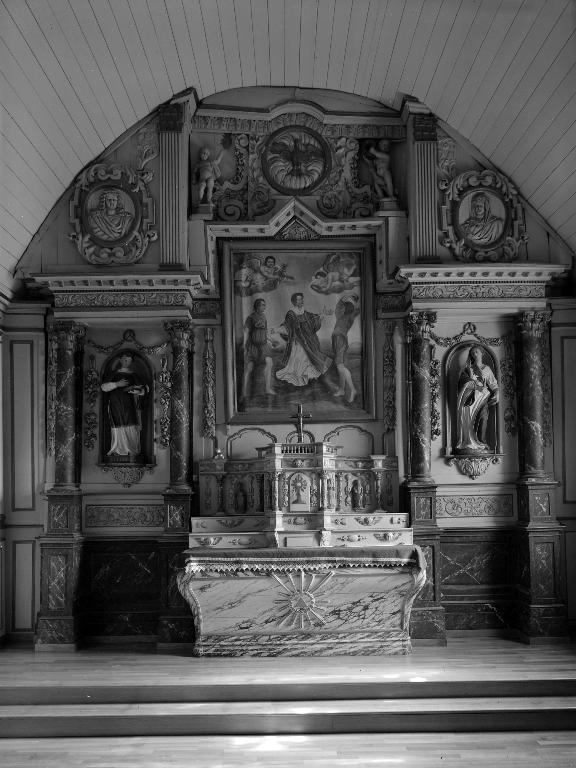 Le retable du chœur est consacré à saint Étienne, patron de la paroisse et premier martyr de l’Église chrétienne. De son origine, il a conservé son architecture : les quatre colonnes peintes en faux marbre veiné noir supportent un entablement à frise lui-même surmonté de trois médaillons sculptés séparés par deux pilastres : la colombe du Saint Esprit est ainsi encadrée des portraits du Christ et de la Vierge. Le tabernacle monumental abrite sur ses ailes quatre figurines. La reconstruction de la deuxième moitié du 18e siècle a introduit un peu de mouvement dans les lignes : l’autel aux formes galbées, les statues de saint Étienne et sainte Anastasie et le tableau central – Martyre de saint Étienne, mort par lapidation - datent de cette époque.