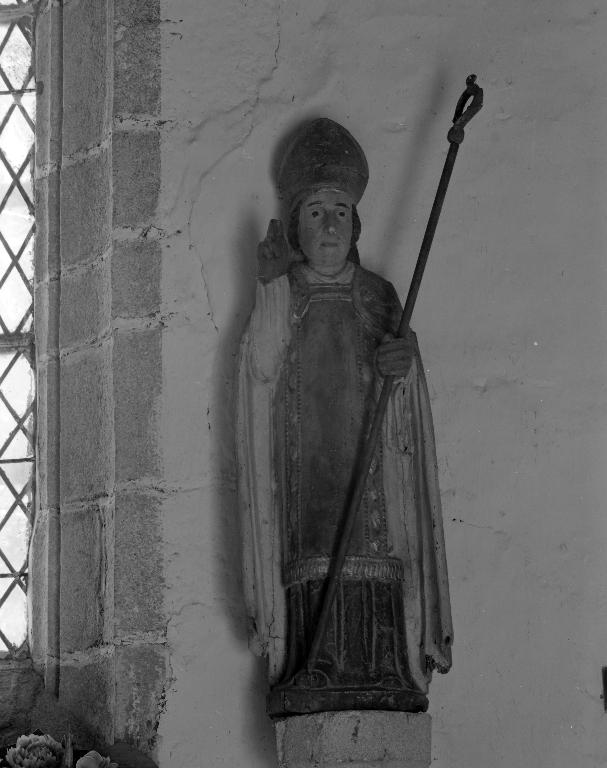 Un sculpteur très attentif aux détails en a dressé là le portrait. Sur la soutane aux plis parallèles et cassant sur le pied, il a mis en relief la bordure à perles et losanges de la chasuble. Le manipule, rarement représenté, posé sur le poignet gauche, la chape, les gants, la mitre… sont complétés par une crosse, qui elle n’est pas d’origine.