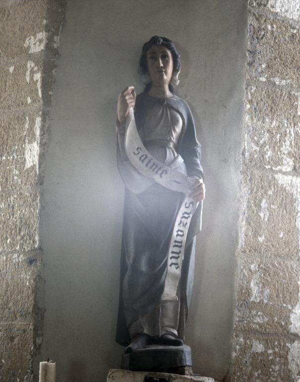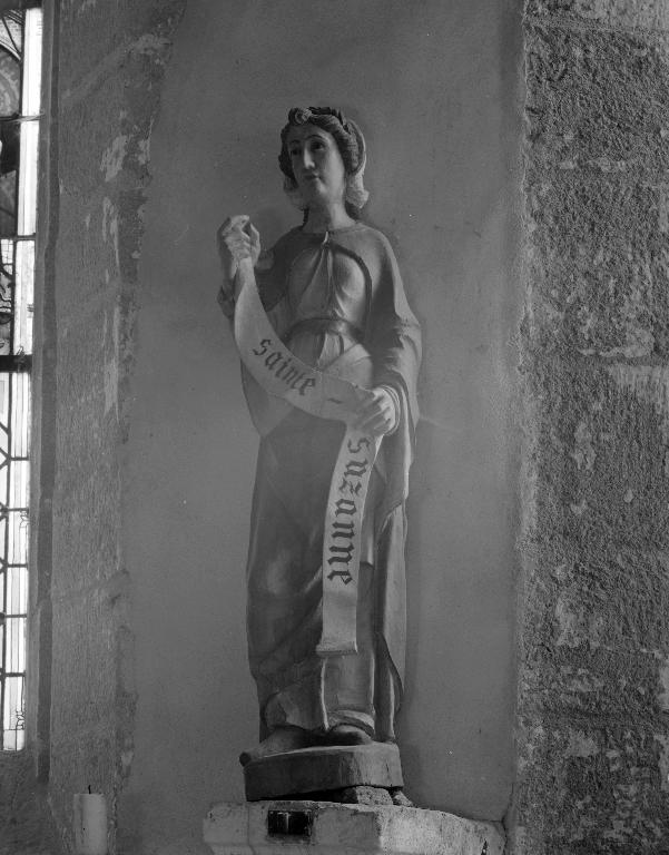 Sainte Suzanne de Rome porte souvent l’épée de son martyre : elle fut décapitée au 3e siècle pour avoir refusé de renoncer à sa foi chrétienne. Ici, faute d’attribut, on a jugé utile d’inscrire son nom sur un phylactère.