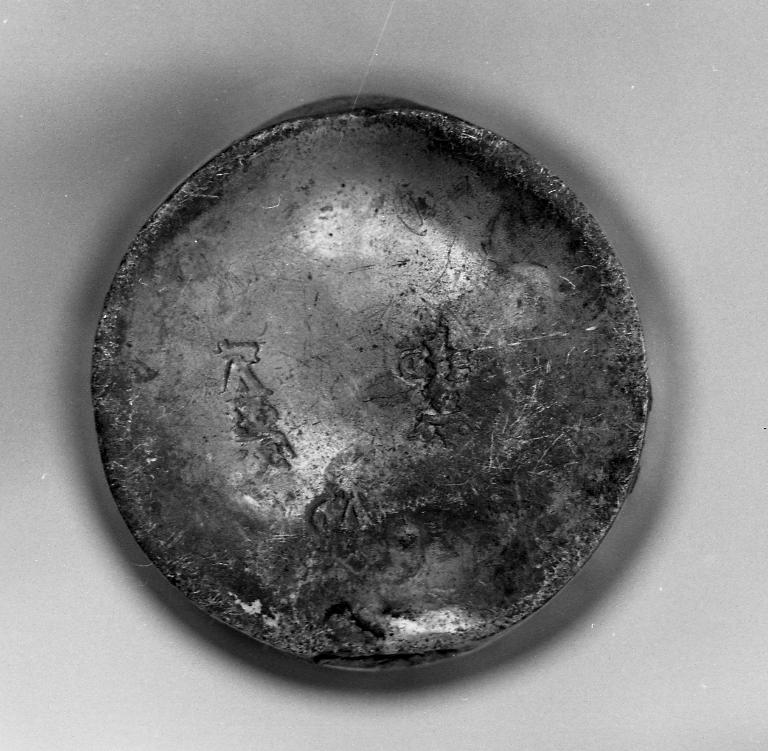 Inscriptions sur le corps et le couvercle : 1ère ampoule : CHRISMA ; 2ème ampoule : OLEVM S. ; Poinçon de charge : soleil, lettre V, un 9 fleurs de lys et rosettes ; Lettre-Date : lettre V surmontée d'une hermine passante, étoiles, couronne, hermine passante au dessous ; Poinçon de maître : lettres H et D, séparées par une hermine, un F en dessous, une couronne ; tous ces Poinçons sous le pied.