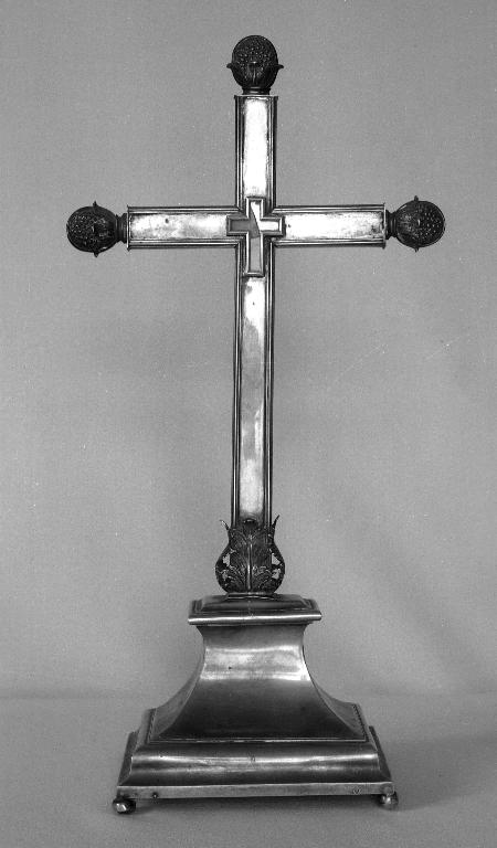 Croix sur base de plan rectangulaire et d'élévation évasée ; base montée sur 4 pieds en boule. Présence d'une âme de bois et d'une plaque de fer ; assemblages par enfilage et soudures.