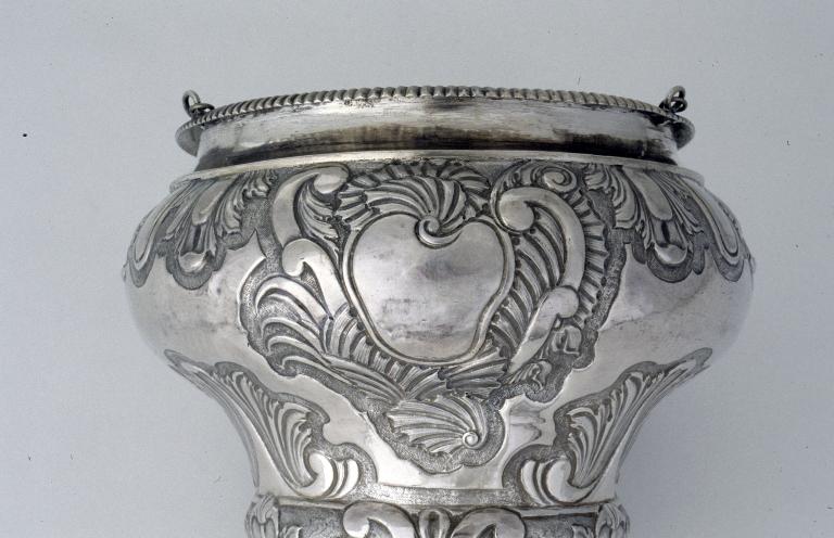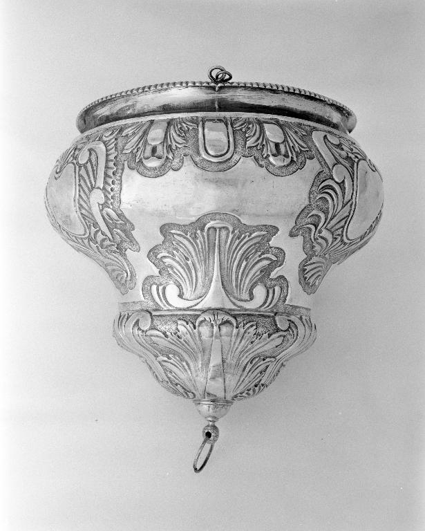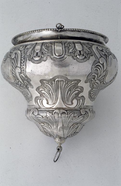 La date 1766-1768 fournie par le poinçon de communauté de Vannes (lettre E couronnée) permettrait d'attribuer la lampe de sanctuaire à l'orfèvre vannetais François Périgaud, actif entre 1766 et 1800. L'interprétation plus réussie du style rocaille laisse à penser que l'objet a été réalisé par deux mains différentes.
