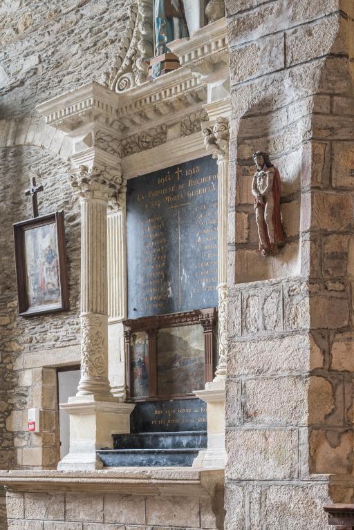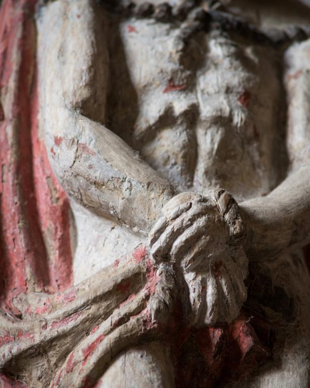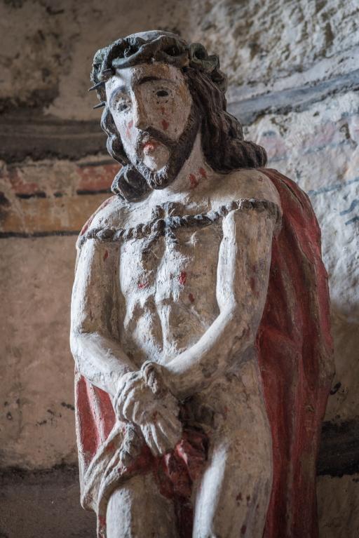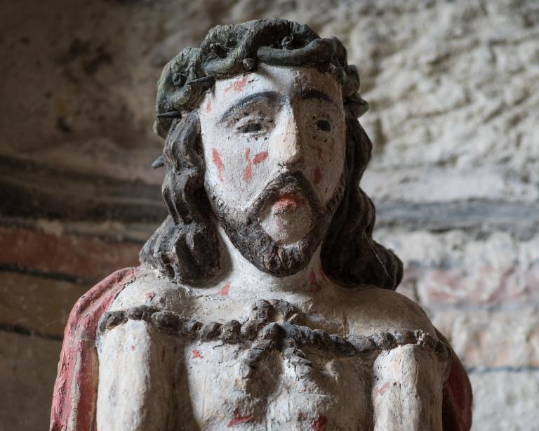 La couronne d’épines qu’il porte le blesse au niveau du front. Les épines sont particulièrement aiguisées (certaines sont aujourd’hui cassées). Il a des gouttes de sang sur le visage.