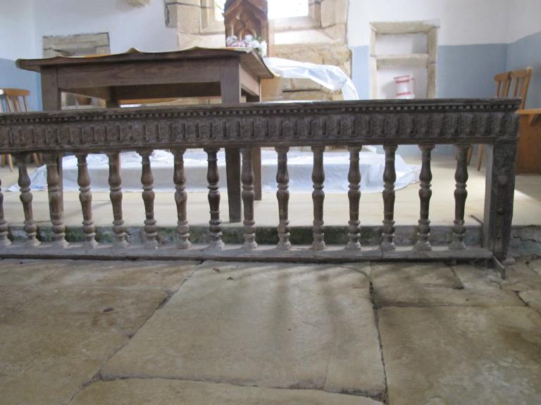 Cette clôture de chœur du 17e siècle, heureusement conservée, est de grande qualité, d'un modèle rare en raison du décor d'inspiration Renaissance sculpté sur la traverse supérieure ainsi que sur les montants. (C. Toscer)