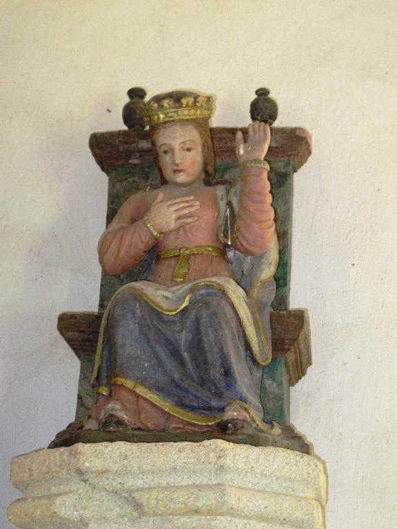 Manque la statue de l'ange composant le groupe (?) ; main gauche mutilée, couronne brisée, brisure nette au niveau du cou, quelques manques sur l'entablement du siège ; fentes.