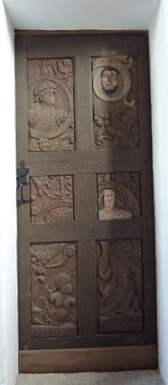 12 panneaux en bas-relief remployés ici dans 2 vantaux de porte ; les panneaux ont été découpés et remontés selon les parties en bon état.