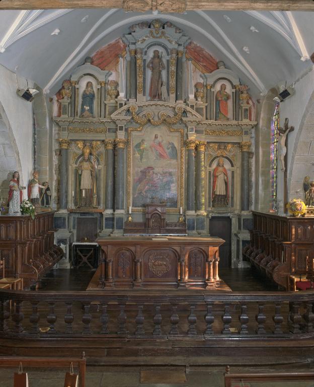 Retable architecturé à 3 travées et à 2 niveaux sur un soubassement ; ses parties latérales sont occupées par une porte d'accès à la sacristie ; le 2e niveau est occupé par des niches de couronnement en cul-de-four ; le corps central est surmonté au 1er niveau d'un fronton cintré brisé à volutes, son 2e niveau est occupé par une niche de couronnement, plus importante que les latérales, et terminée d'un entablement cintré et interrompu dans l'axe.