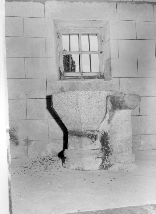Cuve de plan polygonal accostée d'une petite cuve sur pied cylindrique.