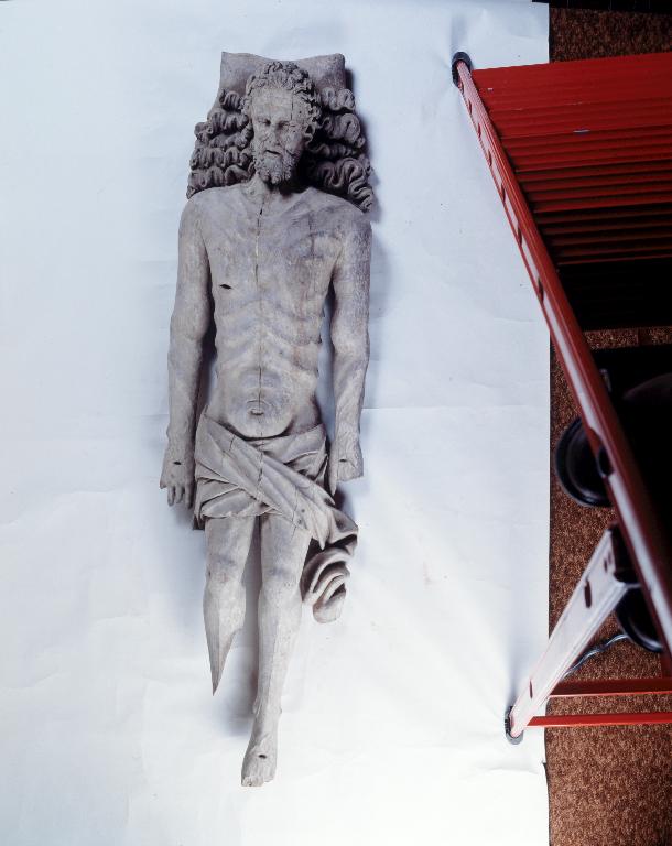 Probablement un élément d'un groupe sculpté représentant une Mise au tombeau ; jambes et mains mutilés, fentes dans le sens du fil du bois.