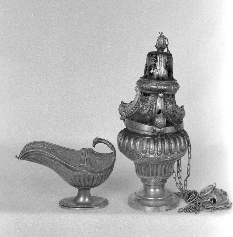Ensemble hétérogène de la 1ère moitié du 19e siècle, composé d'un encensoir exécuté par Jacques Alexandre Basnier, d'une navette à encens exécutée par Jean-Baptiste Simon Lefranc, et d'une cuiller à encens exécutée par Landi, tous orfèvres.
