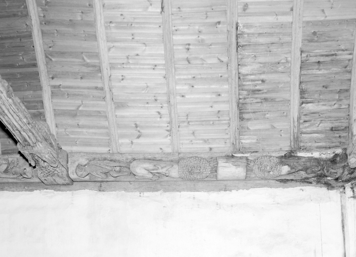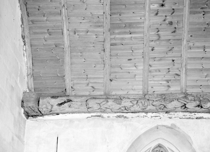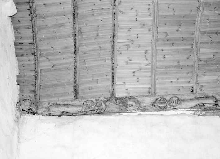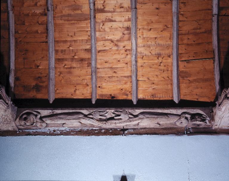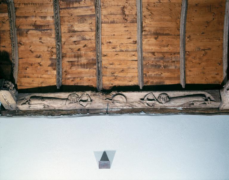 Sur le mur nord de la nef, deux sirènes à corps pisciforme, à buste d’homme pour l’une et de femme pour l’autre, soutiennent un miroir bombé placé au centre de la poutre et tiennent entre leurs mains un peigne et un miroir, symboles de vanité et d’impureté.