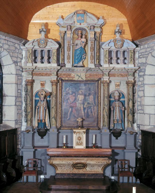 Ensemble autel retable tabernacle du 17e siècle, d'inspiration ou de fabrication lavalloise, repeint en 1853.