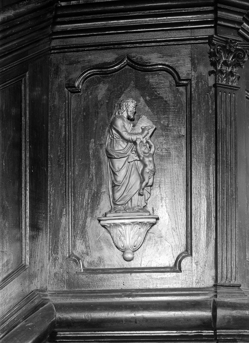 Description : en relief rapporté, les Evangélistes sur les panneaux de la cuve, le Christ enseignant sur le dorsal, la colombe sur l'abat-voix.