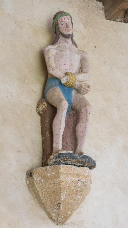 Le Christ est assis sur un muret. Il revêt un perizonium bleu. Son corps est couvert de blessures rouges qui contrastent avec la couleur blanche de sa peau.