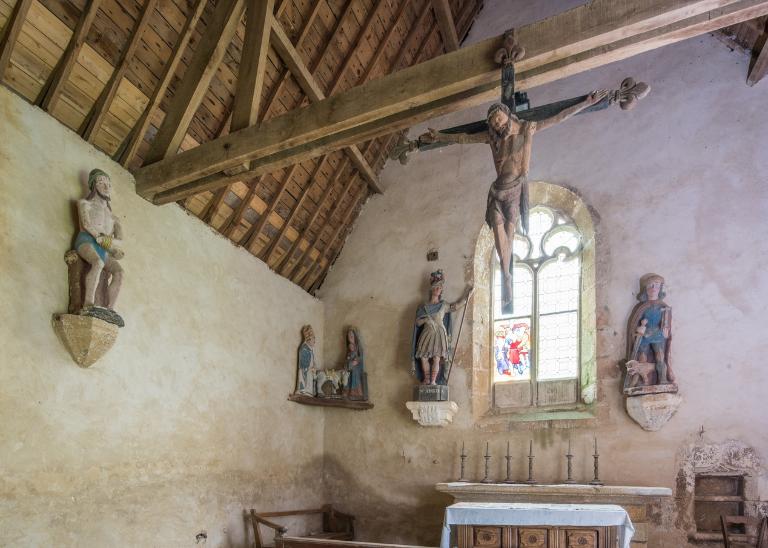 Sa tête, inclinée sur la droite, est couronnée d’une fine couronne d’épines qui lui provoque des blessures : des gouttes de sang perlent sur son front. Ses paupières sont closes.