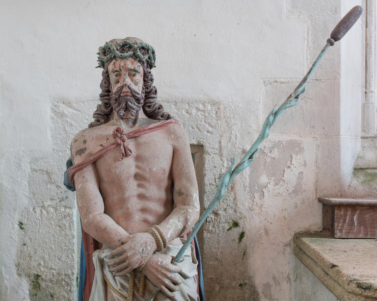 La couronne d’épines enfoncée sur sa tête lui provoque des blessures qui saignent sur son front. Des gouttes de sang perlent également sur ses joues. Ses cheveux et sa barbe sont bouclés. Son regard est tourné vers le sol.