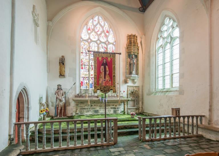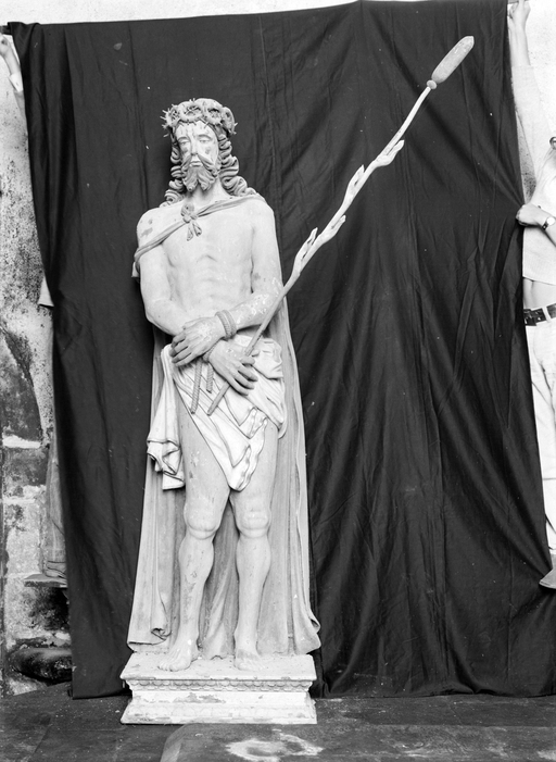 Le Christ est debout. Il porte un perizonium blanc ainsi qu’un manteau pourpre sur le revers et bleu à l’extérieur. Le manteau est noué par un lien au niveau de son torse, il tombe de son épaule. Son torse n’est pas maigre, pourtant on peut voir des plis sur sa peau qui suggèrent la forme de ses côtes. Le reste de son corps est musculeux. Sa position est déhanchée.