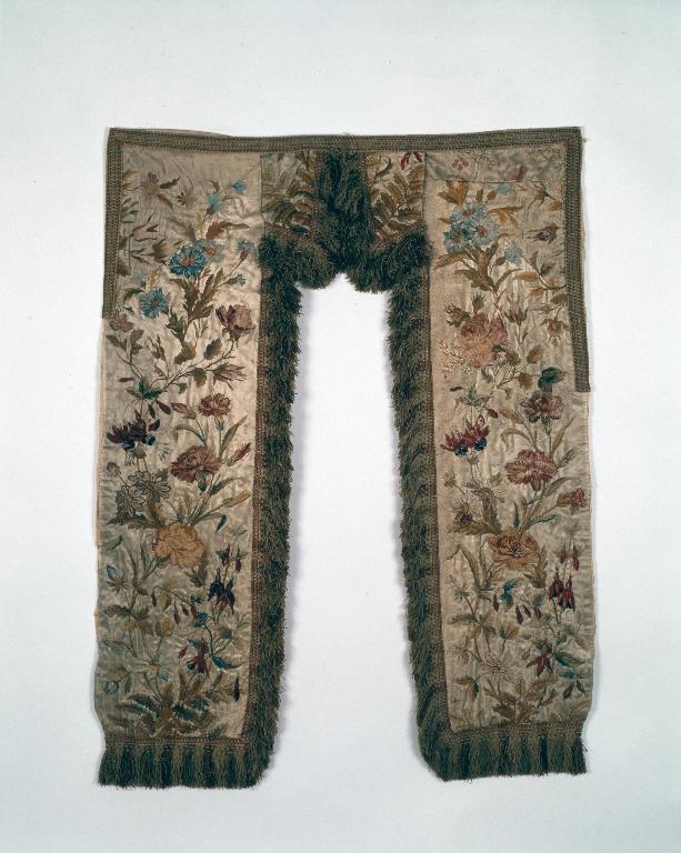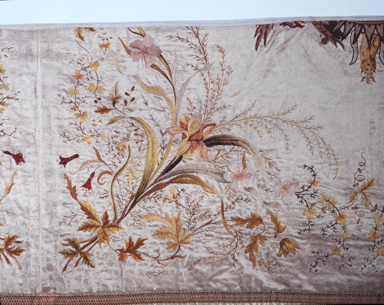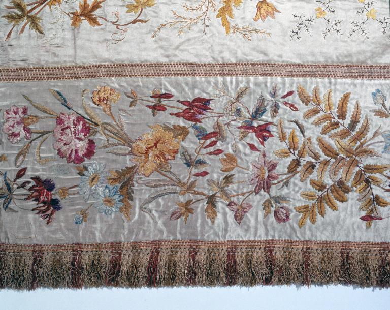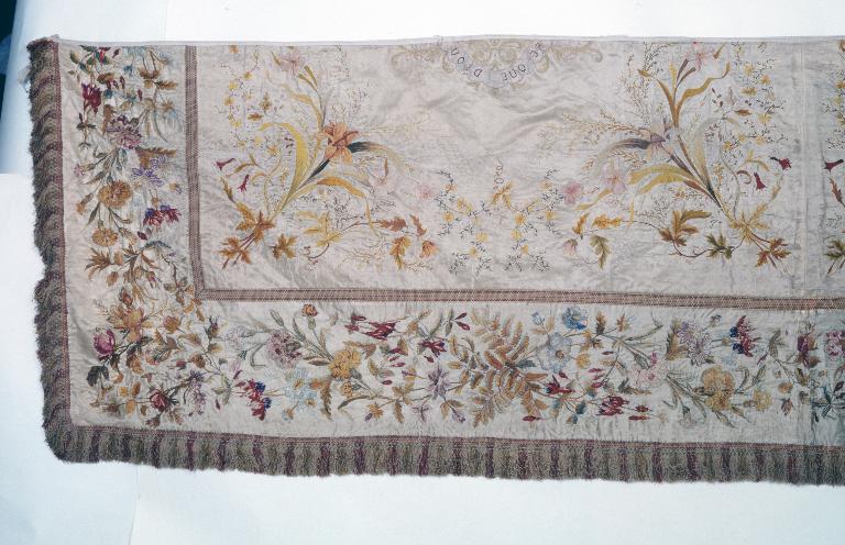 Antependium fabriqué à partir d'un carré de satin brodé coupé par la moitié et dont les deux morceaux ont été juxtaposés par une couture ; satin de 8 ; broderie au point lancé et passé empiétant.