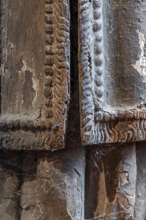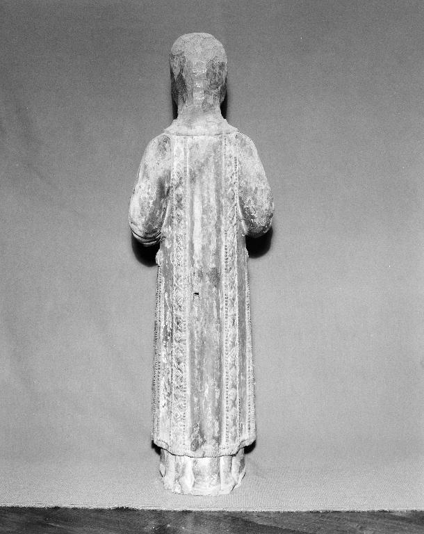 La présence d'un orifice sous le socle indique que cette statue-reliquaire pouvait être placée sur un portant et processionnée. La taille sommaire de l'arrière du crâne laisse supposer qu'un élément rapporté lui tenait lieu de tonsure.
