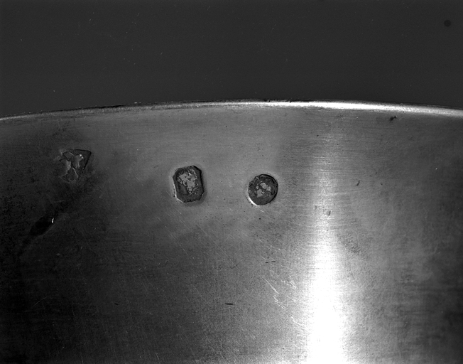 Poinçons sur le pied et le col de la burette, sur la coupe du calice et sur la patène. Poinçon de maître : Q B séparées par une pensée, une fleur de lys au-dessus.