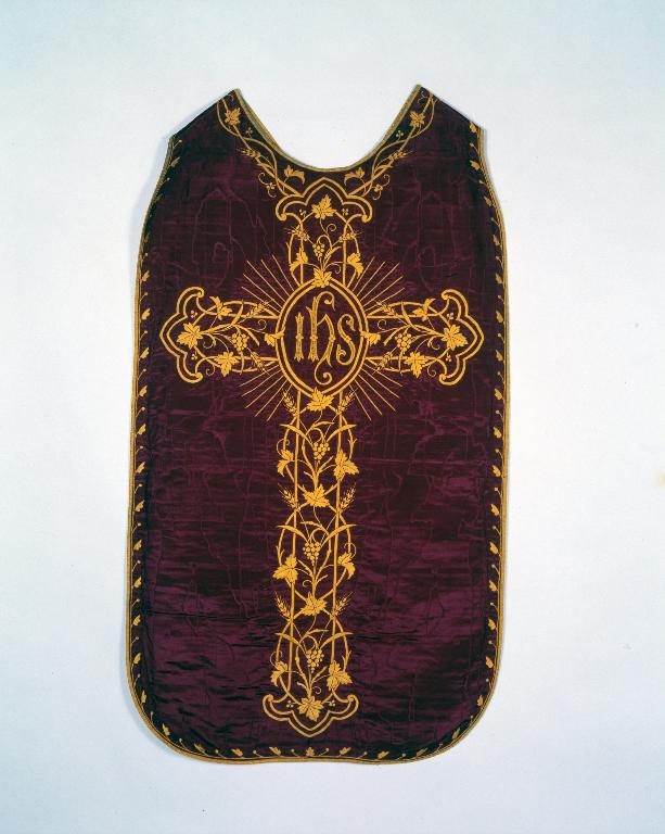 Ornement réversible blanc et rouge 1 : chasuble, bourse de corporal, étole, manipule, basilique Notre-Dame-du-Roncier (Josselin),
